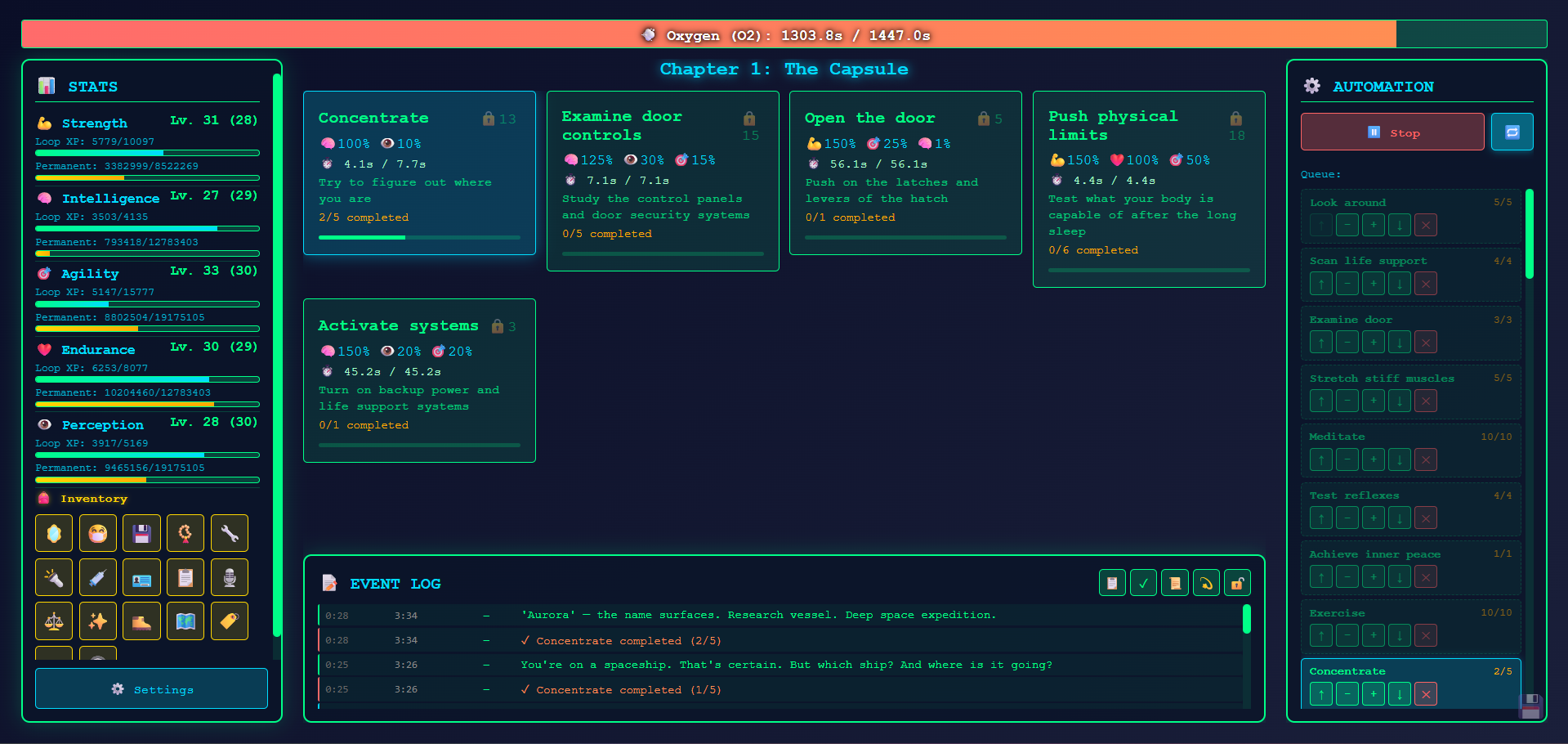 - Loop system — Each cycle you have limited oxygen. Complete activities to gain stats and unlock new ones.